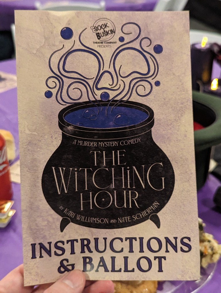 Kari Williamson and Nate Schierman’s The Witching Hour is a murder-mystery-comedy dinner theatre about a group of witches in Salem, MA, running a magic healing retreat. When their magic begins to go haywire, the sisters—Hazel, Athena, and Lorelei, along with their niece Miranda—have to find a way to save their business. Each of the sisters has her own competing idea about how to save the business, and the disagreements lead to significant tension between them. This is compounded by romantic and interpersonal tensions as the sisters bring their romantic partners/interests into the business side of things. But when another local warlock, Phoenix Draco, is killed, it’s up to the audience to determine who dunnit, which we do by asking questions of the characters as they move between the different tables.