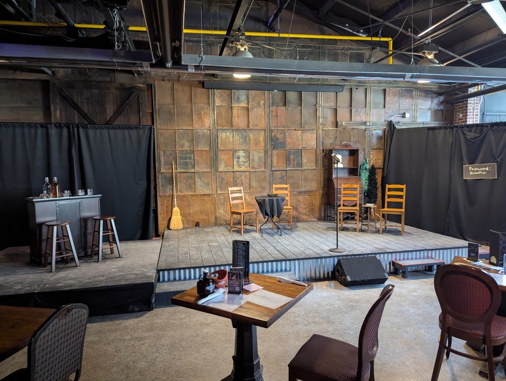 Sock & Buskin performances are consistently excellent, and this was no exception. Each performer brought their own unique style to the character, creating a distinctive set of personalities that felt unique while also fitting in the broad genre of the noir 1920s detective story. For instance, Jack Donahue (Maxwell) played the noir-style detective, with voice over parts in which he spoke directly to the audience, informing us about how the investigation was going, etc. His overconfidence was well-played, with a series of poses struck for emphasis at various points, often with a sudden turn and double finger guns. This repeated gesture built the persona. Similarly, Andrea Boito’s (Ruth) constant use of the broom to threaten or drive unruly patrons out of the speakeasy became a kind of trademark move, to the point where she threatened to get her broom when answering audience questions. Everyone in the cast gave a top notch performance, bringing a comic version of a 1920s speakeasy to life.