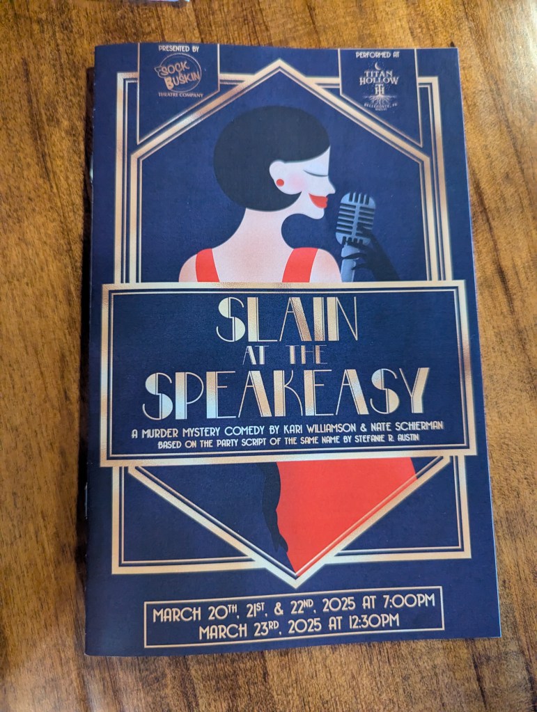 Kari Williamson and Nate Schierman’s Slain at the Speakeasy is a full-length play developed out of an original semi-scripted murder mystery party script by Stefanie Austin, so this is definitely an in-house project for Sock & Buskin Theatre Company. Although this version was based on the original, the full-length production—directed by Henry Morello—doesn’t require audience familiarity with the murder mystery party.