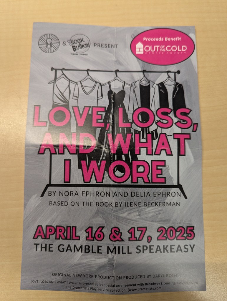 The Gamble Mill and Sock & Buskin Theatre Company co-sponsored a staged reading of Nora and Delia Ephron’s Love, Loss, and What I Wore—adapted from Ilene Beckerman’s novel—as a charity performance to raise money for Out of the Cold Centre County, which is a shelter. The production was directed by Priscilla McFerren.