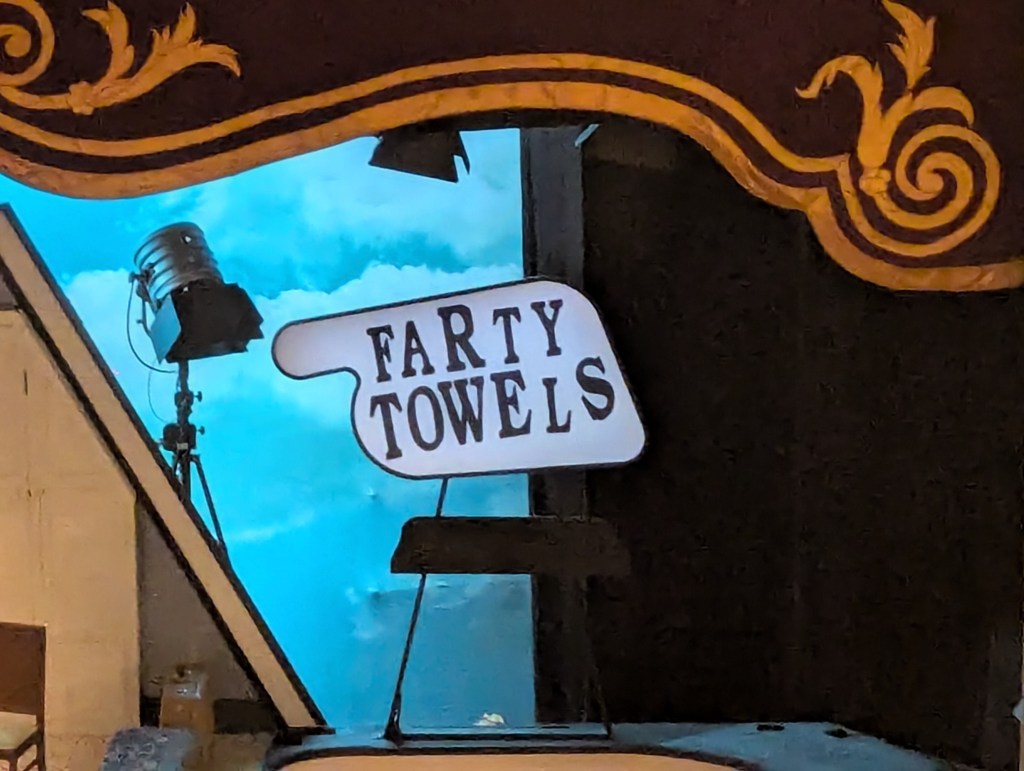What makes this dramaturgically interesting is the question of what this facsimile quality means for the play as an artistic endeavor. The attempt to reproduce exactly this earlier version of the story is, on the one hand, rooted in an appeal to audience nostalgia. From the perspective of ticket sales, reproducing a beloved intellectual property will come with a built-in audience—this is the entire foundation of the British culture industry, why we get so many film and TV versions of Austen, Bronte, Dickens, etc. And especially with something like Fawlty Towers, which so many middle-aged/older British people grew up with, there will be large numbers of potential audience members who want to relive a beloved show of their youths. This partially explains the wide-ranging tour that this production run is going on, bringing this show from London’s West End to a number of small villages and towns that normally would not be included in a theatre tour of this type of production. If you want to sell tickets, it’s not a terrible strategy to give people something they already know and love, without challenging their love for it.