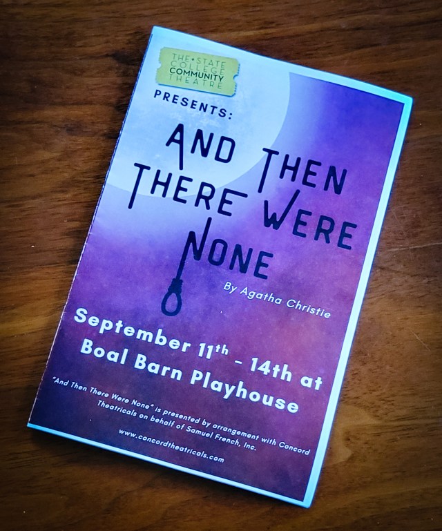 This weekend I saw the State College Community Theatre’s (SCCT) production of Agatha Christie’s And Then There Were None directed by Eli Beers-Altman and assistant directed by Joe Appel. Our story begins with eight very different house guests, eccentric in their own ways, arriving at an isolated mansion situated on an island just off the coast of Devon. They are tended to by two married domestic servants, Mr. Rogers (played by Phillip Zapkin) and Mrs. Rogers (played by Fiona Mulley), who prepare the house for the guests’ arrival. During that first evening, after all of the guests had arrived, Mr. Rogers puts on a record titled “Swan Song,” as he was instructed to do via a letter left by the assumed master of the house—an unknown Owen—whom, we find, Rogers has never met. Instead of mood music, the gramophone bellows a recording accusing all ten people—the eight house guests and the Rogers—of crimes that had gone unpunished by the law. Soon, they start dying, picked off one by one. The remaining guests conclude that the murderer must be one of their own.