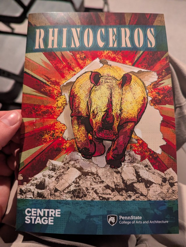 Apart from Shakespeare, one of the first genres of drama I really fell in love with was theatre of the absurd, and so when Penn State’s school of theatre announced that it was opening the 2025-26 season with Eugene Ionesco’s Rhinoceros, I was thrilled to see what they’d do with it. Under the direction of Sam Osheroff, the production was very effective.