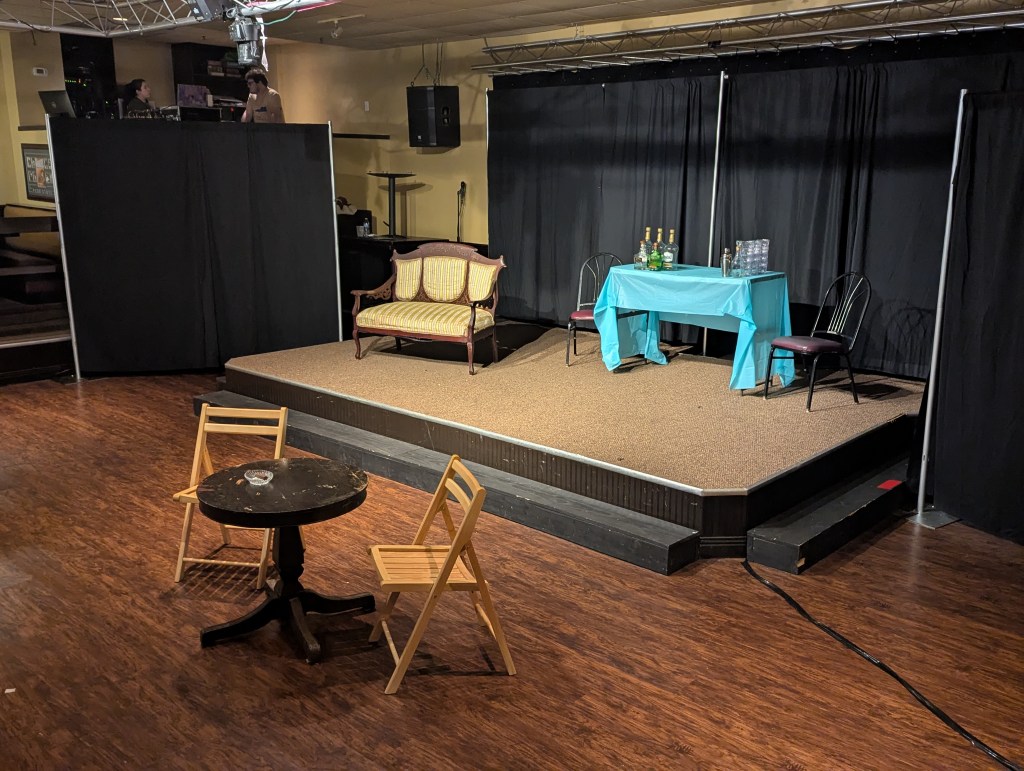 On the technical side, there were mic issues throughout the performance I saw—though most not as consistent as Shao’s mic. I can’t really criticize SCCT for this, because wireless mics are consistently finicky. I’ve had issues with them before, both as a performer and a director, so I know there’s a number of things that can go wrong with them. But losing the mics does make it difficult to hear dialogue in a space like a bowling alley bar and grill, which really isn’t acoustically designed to function well as a theatre.