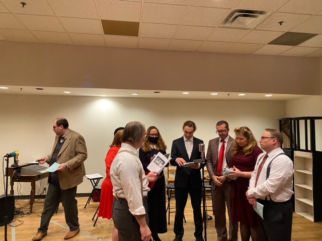 Williamson and Schierman have written the short prelude piece Behind the Scenes at WBFR to introduce the action in Landry’s play. Bert is the show’s producer, who is panicking because a snow storm has prevented many of the actors from arriving at the studio. He frantically tries to pull together a competent performance to impress the station manager, whose son is one of the actors. When he realizes that the announcer, Freddie Filmore, also hasn’t arrived, Bert is forced to take on that role, which begins and ends Landry’s play.